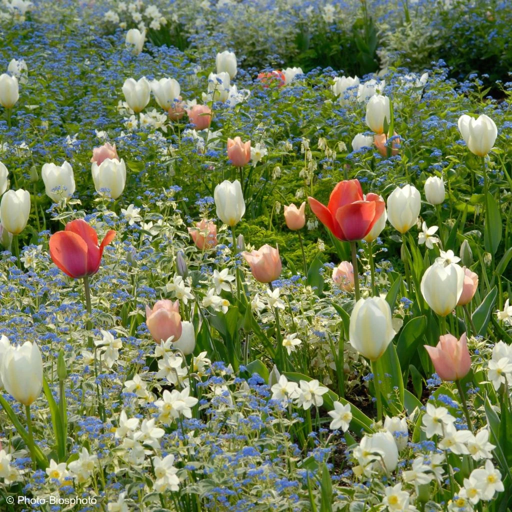Avec cette collection, tout est dans l’harmonie et la délicatesse ! Les tulipes offrent au regard leurs coupes élégantes parées de blanc, de rose saumoné et d’abricot tendre parmi lesquelles émergeront en bouquets dansants les petites fleurs presque blanches et parfumées du Narcisse. L’ensemble permet de composer sans difficulté un décor inoubliable pour fêter en beauté l’arrivée du printemps. Sublime avec des myosotis bleus ou blancs.